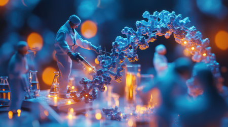 Scientists Working on DNA Strand in Futuristic Laboratory with Neon Lights