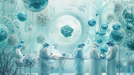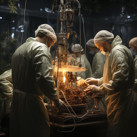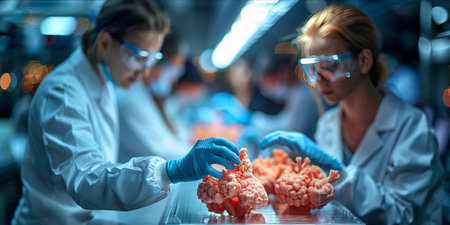 Scientists examining lab-grown organ tissues in futuristic laboratory with advanced equipment and protective gear.