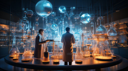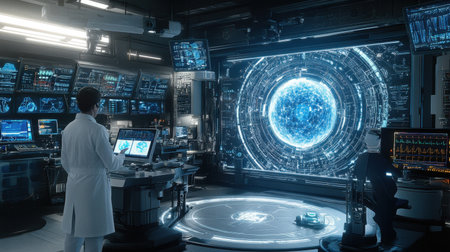 futuristic and high-tech research laboratory with two scientists in white lab coats working. The interior features glowing blue neon lights, large holographic data screens, and advanced machinery, suggesting innovation and science development.