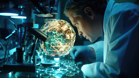 Male scientist analyzing biomaterial samples and examining cell structures in laboratory