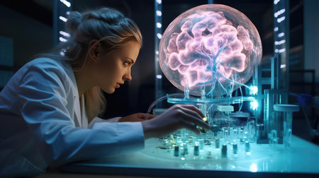 Medical professional in a dimly lit lab, focusing on a floating holographic projection of a brain
