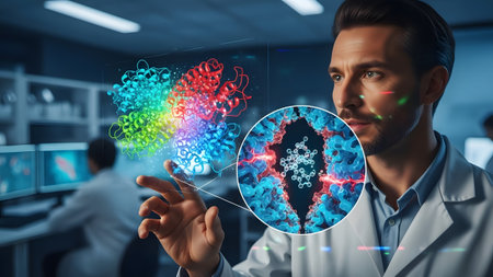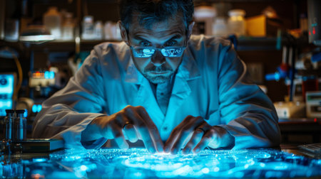 Researcher studies vibrant holographic protein and DNA helix with magnified view. Clear details a...
