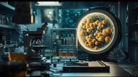 A detailed view of a laboratory setting featuring a microscope, a circular illuminated display showcasing a specimen, and various scientific equipment.