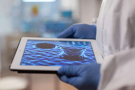 Close up of chemist doctor working on tablet with DNA scan image analysing treatment results. Scientist examining virus evolution using high tech technology researching vaccine development