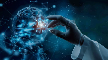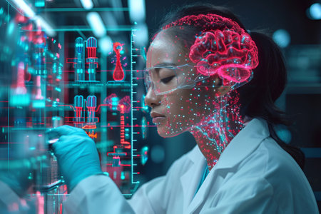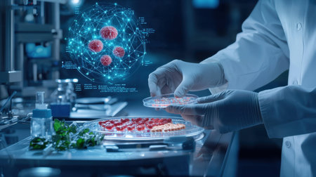 A focused scientist conducts research in a modern laboratory, handling petri dishes while digital biological data visualizes complex interactions, symbolizing health innovation.