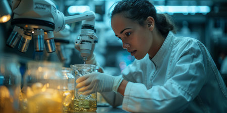Female scientist conducting an experiment with laboratory equipment and microscope in a research lab