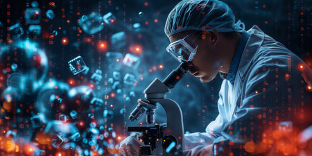 Scientist using microscope with glowing digital data and futuristic visuals in a high-tech laboratory setting.