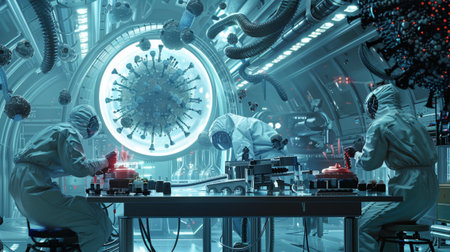 A high-tech laboratory scene depicting scientists in protective suits conducting research on viruses. The environment showcases advanced technology and equipment vital for scientific exploration.