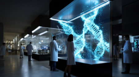 An artistic rendering of a virtual laboratory where scientists interact with holographic displays of CRISPR guide sequences emphasizing collaboration between artificial intelligenc
