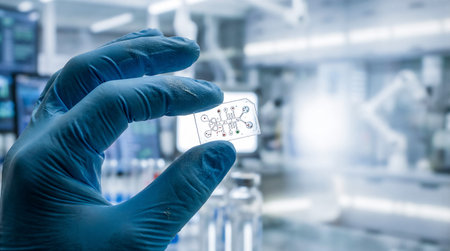 Scientist hand in blue glove holding microfluidic chip for inspection, biotechnology research concept, laboratory setting. Focus on scientist. Image created using generative AI.