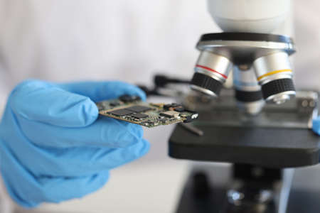 Close-up of male hands holding microchip. Man in special uniform making diagnostics of computer part. Worker checking pc microcircuit. Electronics and technique concept