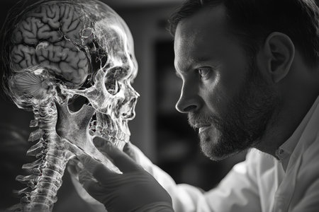 A medical professional closely examines a detailed skull model, highlighting the anatomical structure of the human skull and brain. The focus is on understanding complex features in a well-lit clinical environment.