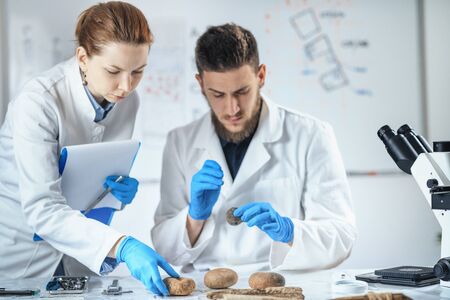 Archaeologist analyzing ancient artifacts, loom weight or fishing net weight.