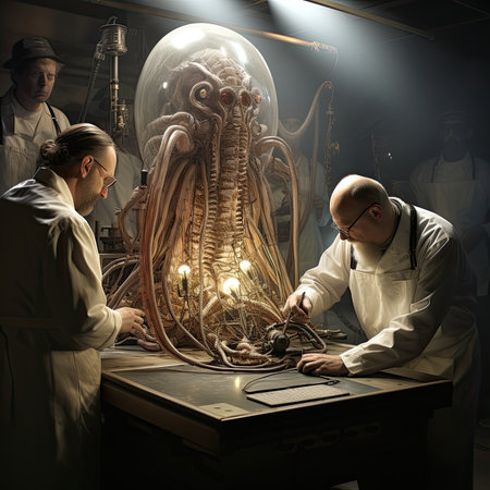 Vintage fictional photograph of scientists analyzing an alien. Generative AI