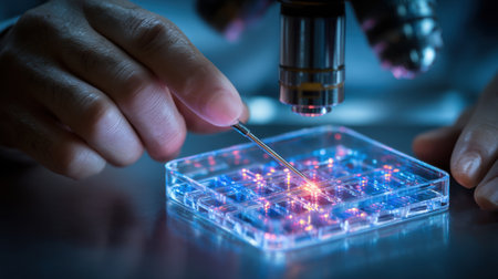 A scientist skillfully manipulates samples with a pipette while observing them under a microscope.
