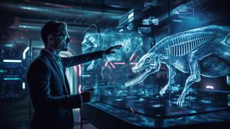 Futuristic paleontology research virtual interaction with dinosaur reconstructions