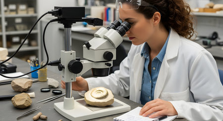 A focused female paleontologist or geologist in a lab coat examines an ammonite fossil under a microscope in a laboratory setting. She is taking notes in a notebook, dedicated to her scientific research and analysis. The image represents women in STEM, scientific investigation, and the study of natural history.