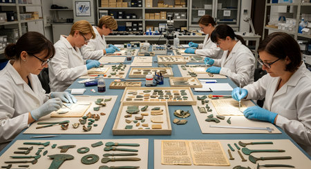 A team of dedicated female archaeologists and conservators in white lab coats meticulously work on cleaning and cataloging ancient bronze artifacts at a large table in a laboratory. They are surrounded by trays of historical objects, reference books, and conservation tools. The scene highlights the patient and precise work of historical research and preservation.
