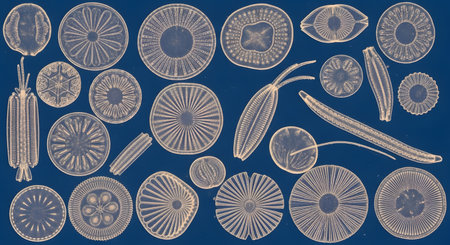 A vintage scientific illustration showing a collection of various diatoms and other plankton with intricate geometric patterns. The detailed, antique-style drawings are set against a solid blue background, representing biology, microscopy, and natural history.
