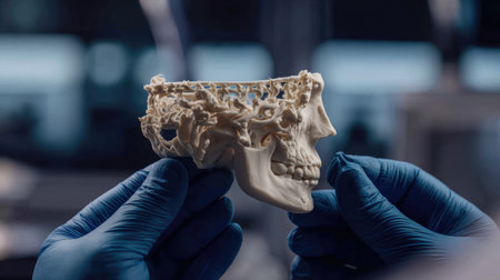 A hands-on view of a 3D printed human skull model highlights intricate designs and textures in a modern medical laboratory setting.