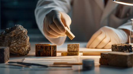 A geologist examining mineral samples in laboratory with rock cores and polished cubes, gloved hands handling specimen, analytical setup