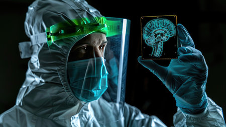A person clad in a protective suit carefully examines a detailed brain scan, revealing vital insights into neurological health.