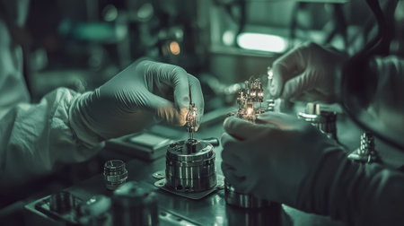 Close-up of hands assembling detailed electronic components in a laboratory setting, highlighting precision and technological expertise in the field of electronics.