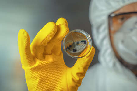 Microbiologist holding petri dish with Fungal (mycotic) cultures in laboratory, selective focus