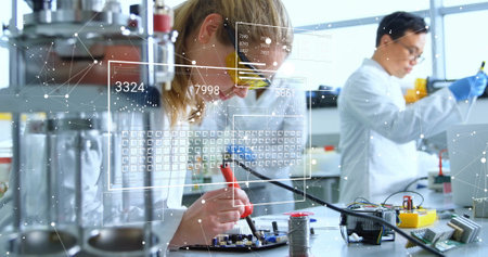 Image of scientific data processing over diverse scientists in laboratory. Global science, connections, computing and data processing concept digitally generated image.
