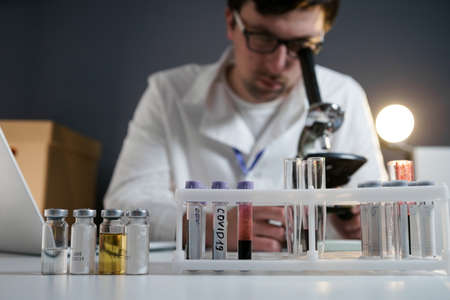 FPV of doctor researcher putting chemical glass vessel with blue liquide on desk working in equipped laboratory looking at DNA scan image developing vaccine against covid 19 virus.