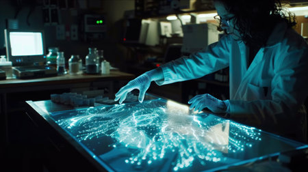A scientist in a laboratory coat interacts with a holographic interface displaying advanced data visuals, embodying cutting-edge research and technological innovation.