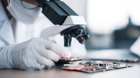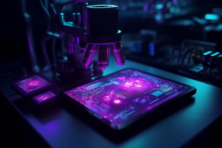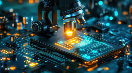 A high-tech microscope is positioned over a circuit board exhibiting illuminated components while a digital data display presents intricate details in this futuristic setting.