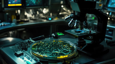 A sophisticated laboratory scene featuring a microscope and illuminated petri dish, conveying a high-tech environment ideal for scientific research and experimentation.