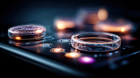In a sterile laboratory setting, a powerful laser activates a microchip submerged in a petri dish, symbolizing a groundbreaking fusion of biology and technology.