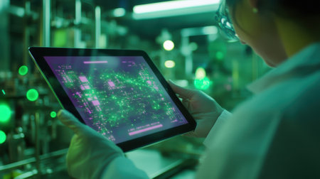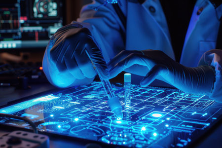 Laboratory scene showcasing a scientist manipulating a microfluidic chip amidst glowing interfaces displaying real-time data. the environment reflects cutting-edge technology and precision in advanced scientific research and analysis.