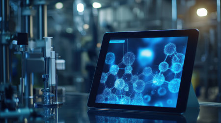 Digital tablet showing molecule structure in pharmaceutical industrial factory