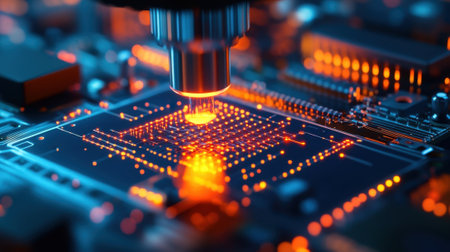A vibrant circuit board is illuminated by colorful lights in a state-of-the-art electronics lab showcasing technology.