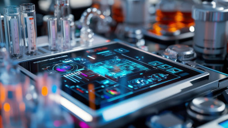 A modern smartphone displays data analysis in a laboratory filled with test tubes and advanced equipment, emphasizing technology's role in scientific research.