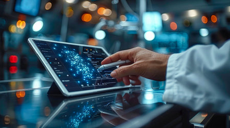 A doctor uses a tablet to access patient information in a bright, modern setting.