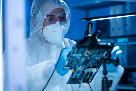 An engineer working in a laboratory wearing a special uniform and protective gloves holds new processor in hands and examines it