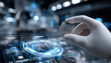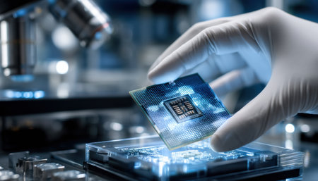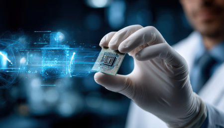 A man is holding a computer chip in his gloved hand. Concept of technology and innovation, as the man is likely a scientist or engineer working with advanced electronic components