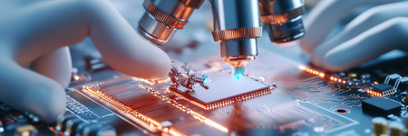 Electrical engineers assembling a microchip under a high-powered microscope,