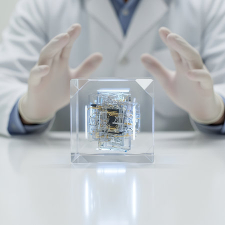 A person in a lab coat and gloves observes a glowing, intricate microchip contained within a transparent cube. This scene represents innovation and advanced technological development in a clean labora
