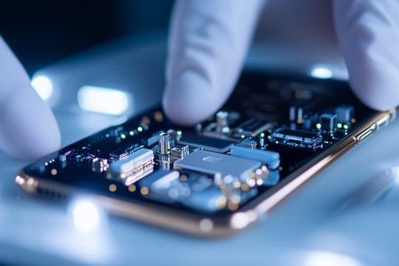 A technician carefully examines the intricate circuitry of a smartphone with gloved hands in a lab.