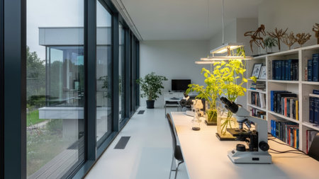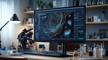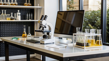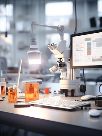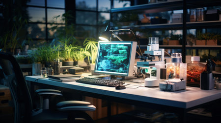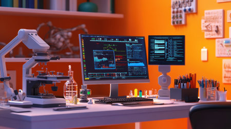 This vibrant laboratory workspace showcases advanced technology, including computers and microscope, designed for scientific research and innovation.