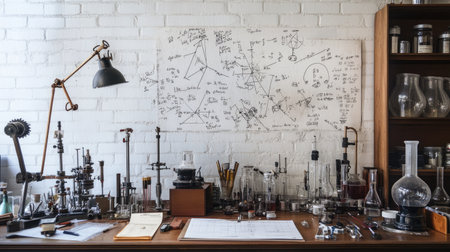 A vintage laboratory workspace showcasing an array of scientific equipment, glassware, and handwritten notes on a white brick wall, creating an inspiring atmosphere for experimentation and creativity.