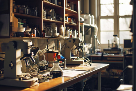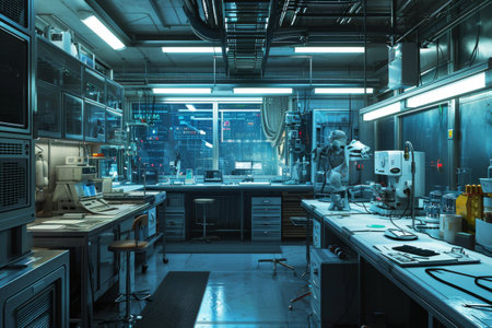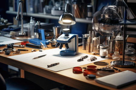 A scientist's bustling lab filled with high tech equipment, urrounded by scientific equipment, notebooks, and various research tools in a bustling setting Ai generated