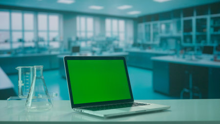 Laptop with Green Screen on Research Biochemistry lab Desk. Advertising area, workspace mock up.