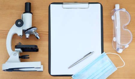 Getting started on a new research project. High angle shot of a microscope, clipboard, pen, protective glasses and face mask on a table.