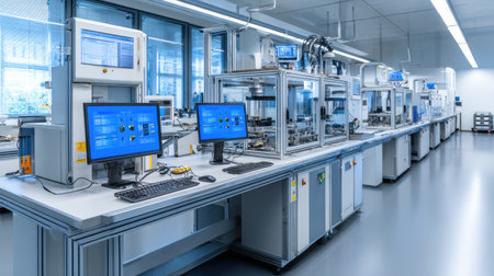 A state-of-the-art manufacturing facility featuring advanced automation technology, digital displays, and an organized workspace, highlighting modern industrial processes and efficiency.